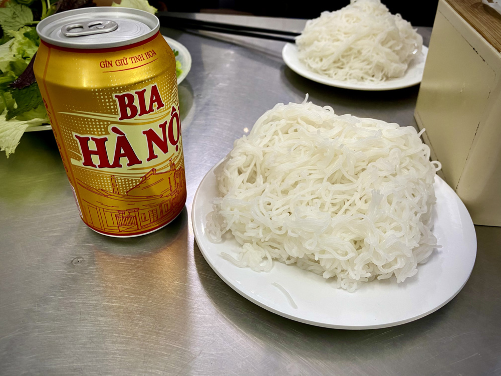 「コンボ・オバマ」は、ブンチャーと海鮮揚げ春巻き、そしてハノイビール1本がセットになったものです 。価格は現在、120,000ドン(約700円)ほど 。